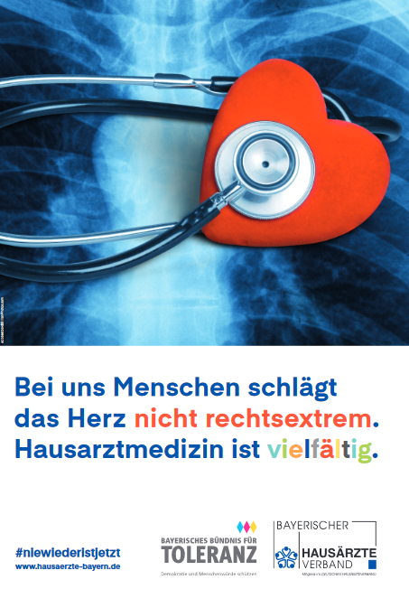 Flagge zeigten Bayerns Hausärztinnen und Hausärzte auch mit dem ebenfalls einstimmig verabschiedeten Leitantrag für Toleranz. Angesichts der Pläne rechtsextremistischer Kreise zur massenhaften Ausweisung von Menschen mit Migrationshintergrund gehe es darum, sich klar gegen Rechtsextremismus, Antisemitismus und jede Form von Diskriminierung positionieren. Als Ehrengast auf dem Podium stellte Dr. Philipp Hildmann, Geschäftsführer des Bayerischen Bündnisses für Toleranz, die gemeinsame Plakataktion „Unser Herz schlägt nicht rechtsextrem“ vor, das mittlerweile viele Kolleginnen und Kollegen in ihren hausärztlichen Praxen aufgehängt haben.