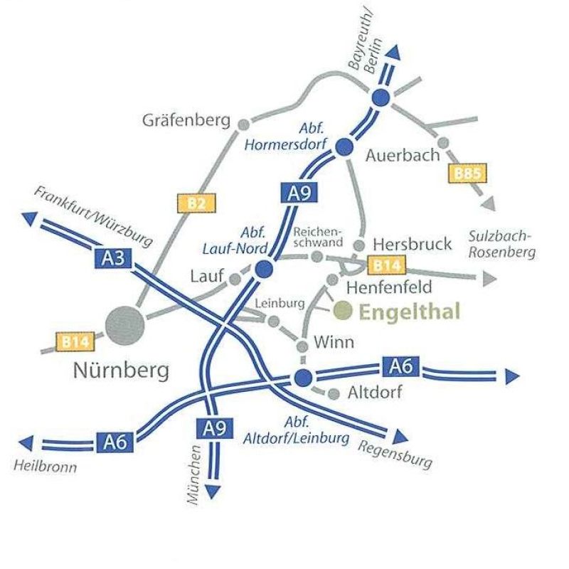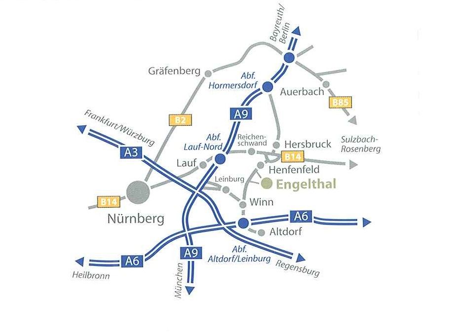 Engelthal liegt nur 25 Autofahrminuten von Nürnberg entfernt im landschaftlich reizvollem Hammerbachtal im Zentrum des Nürnberger Lands zwischen Lauf-Altdorf-Hersbruck mit guter Verkehrsanbindung an die BAB A3, A6 und A9, die B8 Nürnberg-Hersbruck und die S-Bahn Linie 2 Nürnberg-Hartmannshof.