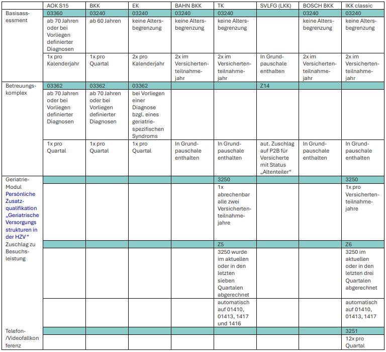 Die Erfassungsziffer für den geriatrische Betreuungskomplex kann bei den HZV-Verträgen der AOK Bayern, BKK und EK als Einzelleistung abgerechnet werden. Bei der SVLFG (LKK) wird automatisch auf jede Grundpauschale von Versicherten mit den Status „Altenteiler“ der Zuschlag Z14 vergütet, wenn die Qualifikation „Hausärztlich geriatrisches Basisassessment“ per Selbstauskunft vorliegt. In den anderen Verträgen ist diese Betreuungsleistung Bestandteil in der Grundpauschale.