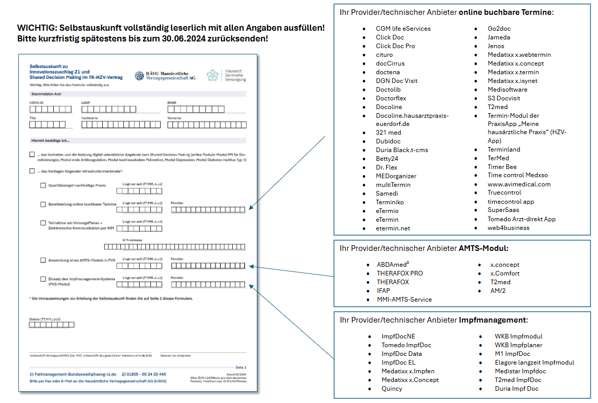 Im Rahmen des neuen TK-HZV-Vertrages gibt es ab dem 01.07.2024 einige Anpassungen: Unter anderem wurde der Innovationszuschlag neugestaltet, wodurch Sie ein höheres Honorar von bis zu 11 € (bisher 8 €) erhalten können. Um diese Vergütung möglichst bald erhalten zu können, müssen Sie die in der Praxis vorliegenden Innovationsmerkmale mit dem Selbstauskunftsbogen an die HÄVG zurückmelden.