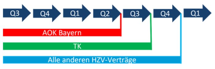Je nach Vertrag gelten für das Nachreichen der HZV-Leistungen unterschiedliche Nachreichfristen (NF) zwischen 3 und 5 Quartalen: