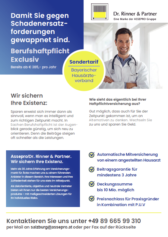 Die ASSEPRO Versicherungsmakler GmbH/Dr. Rinner & Partner bietet Mitgliedern des Bayerisvchen Hausärzteverbandes diese Versicherungen zum Sondertarif.